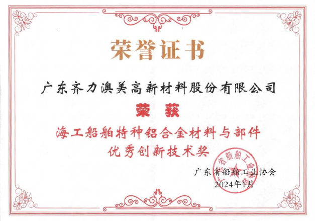近日,廣東齊力澳美高新材料股份有限公司在廣東省船舶工業(yè)協(xié)會(huì)通過了“海工船舶特種鋁合金材料與部件關(guān)鍵技術(shù)研究及產(chǎn)業(yè)化”項(xiàng)目的科技成果鑒定會(huì),榮獲“優(yōu)秀創(chuàng)新技術(shù)獎(jiǎng)”。這是對我司在船舶鋁型材產(chǎn)品研發(fā)和創(chuàng)新方面的高度認(rèn)可,也是對我司船舶產(chǎn)品質(zhì)量和技術(shù)水平的肯定。